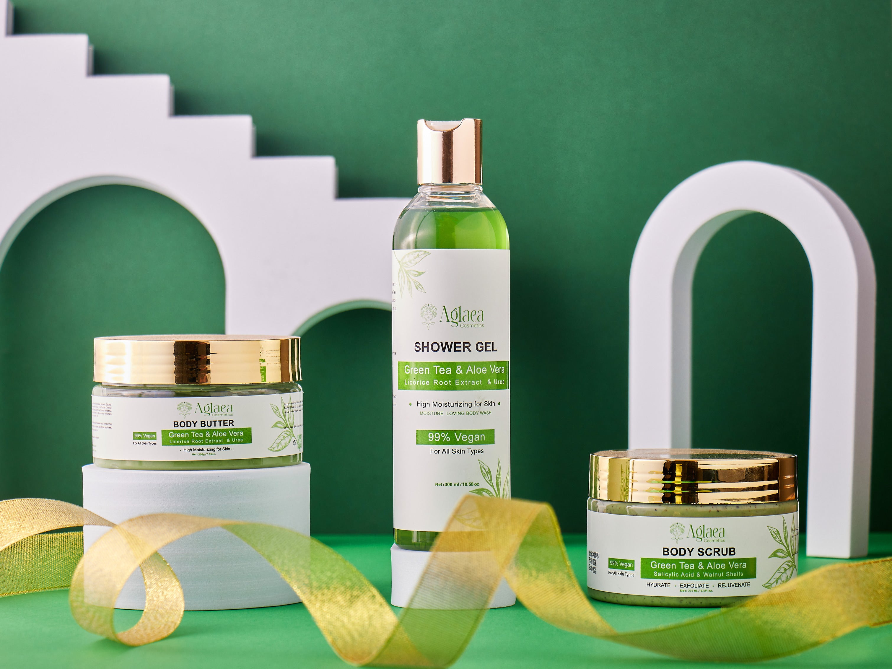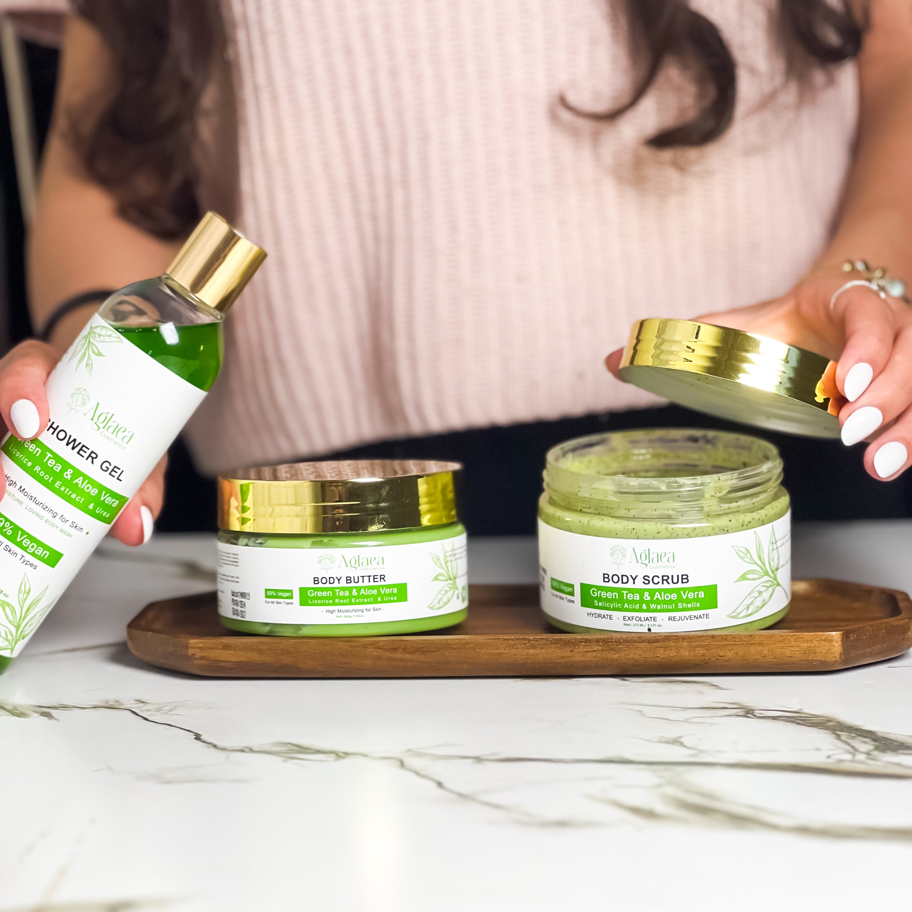 • بكج أجليا بالشاي الاخضر والألوفيرا(مقشر 275 مل +زبدة 200 مل +شاور جل 275 مل ) +ليفة مجانا